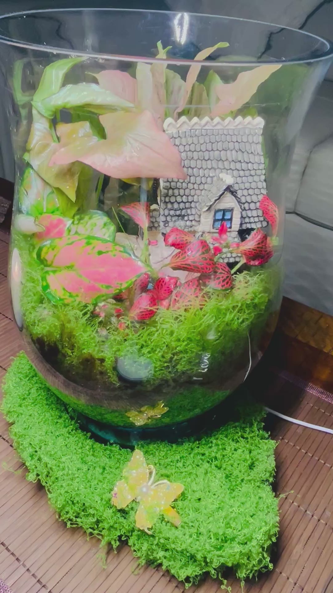 Step into a fairytale world with this handcrafted Shoe House Terrarium. Nestled beneath the glass dome lies a charming miniature shoe house surrounded by lush green moss, vibrant plants, and natural textures, creating a magical woodland scene.